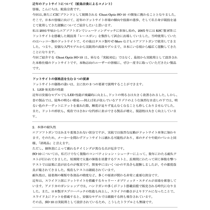 Ghost Optic SO-10は、CZ Customのオプティック部門と日本企業の共同開発による製品で、競技と実戦の両方に対応。